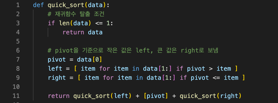- 기준점(Pivot)을 정해서 기준점보다 작은 데이터는 왼쪽(Left), 큰 데이터는 오른쪽(Right)으로 모으는 작업을 재귀적으로 수행한 뒤, Left + Pivot + Right 값을 리턴하는 알고리즘