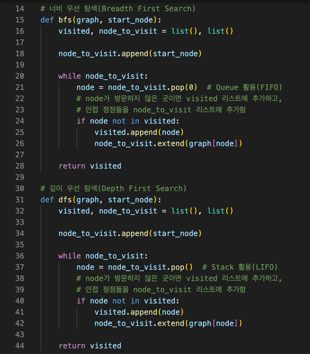- 노드 수를 V, 간선 수를 E라고 하면 BFS, DFS 모두 시간 복잡도는 O(V+E)