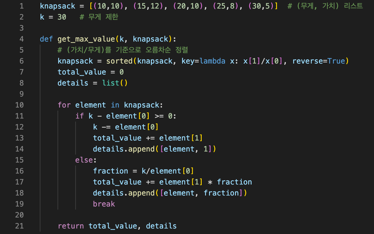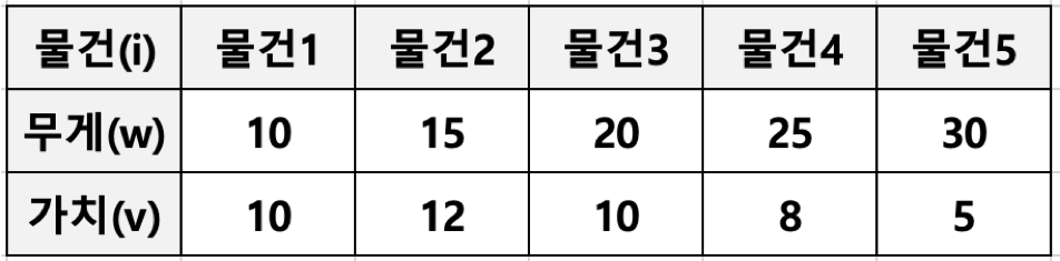 (예제 2) 부분 배낭 문제(Fractional Knapsack Problem) - 무게 제한이 k인 배낭에 최대 가치를 가지도록 물건을 넣는 문제, 물건을 쪼개 일부분만 배낭에 넣을 수 있음