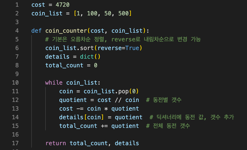 (예제 1) 지불해야 하는 값이 4,720원일 때 1원, 50원, 100원, 500원으로 동전의 수가 가장 적게 지불할 경우는?