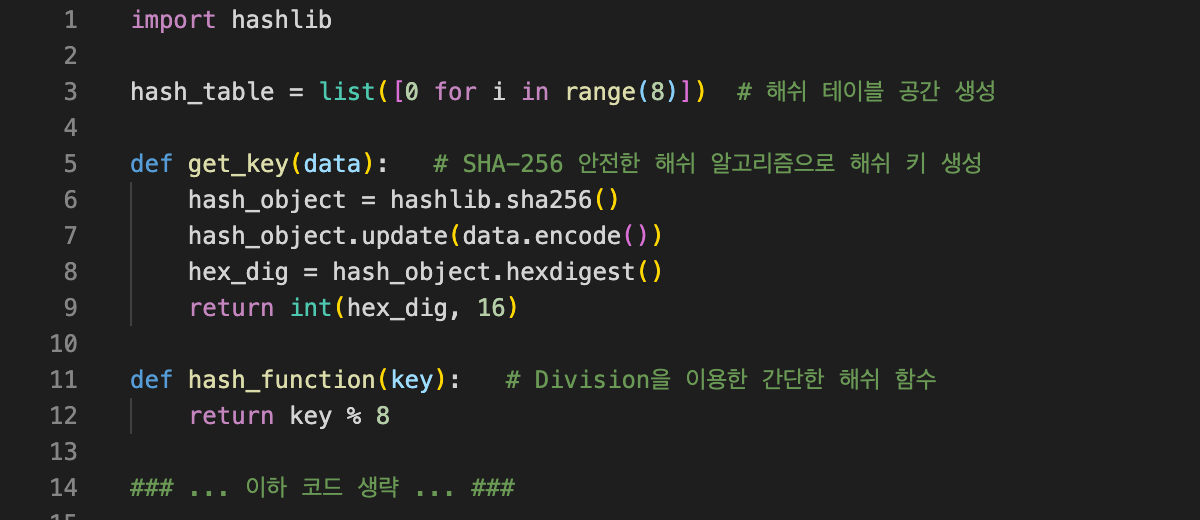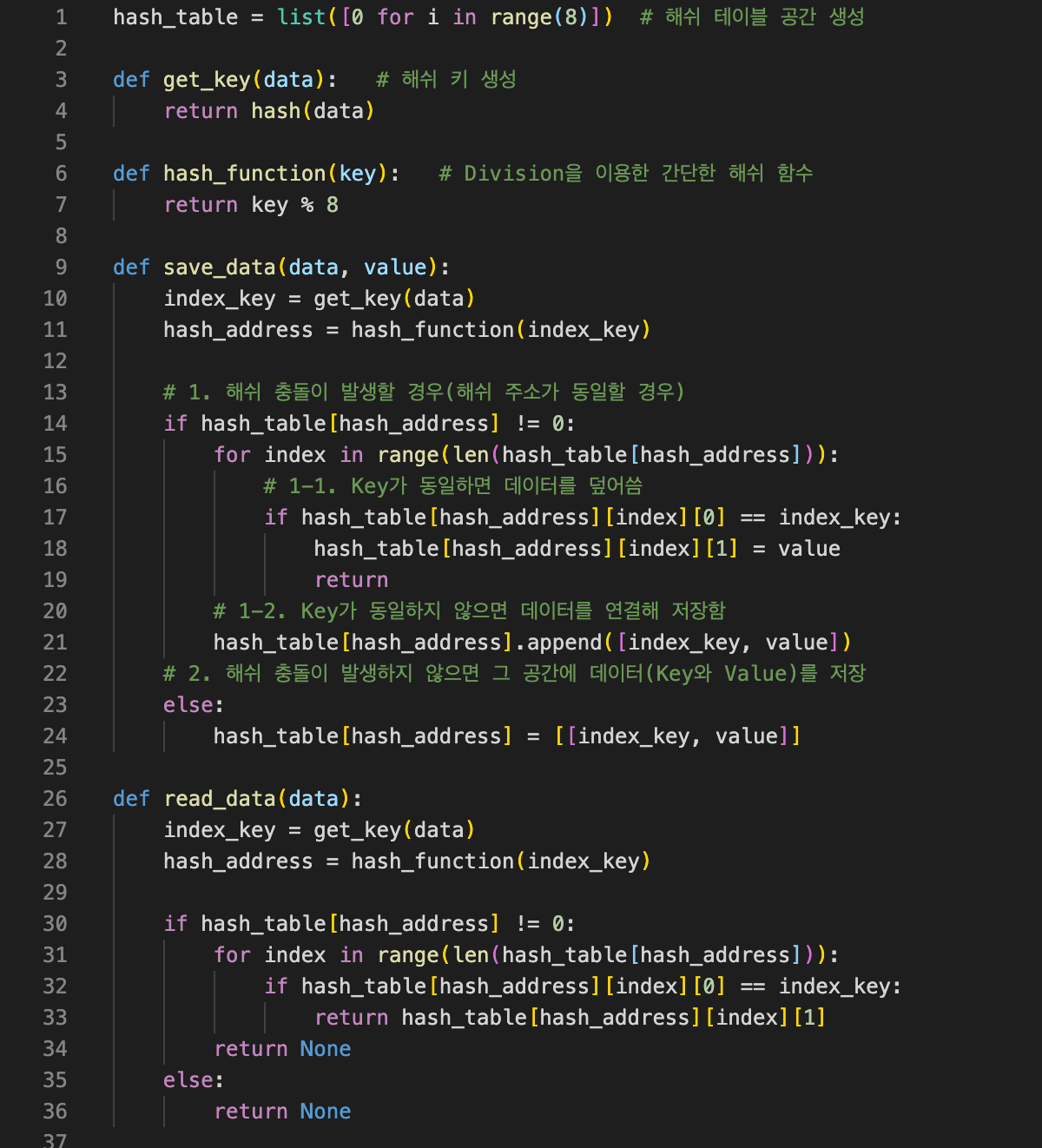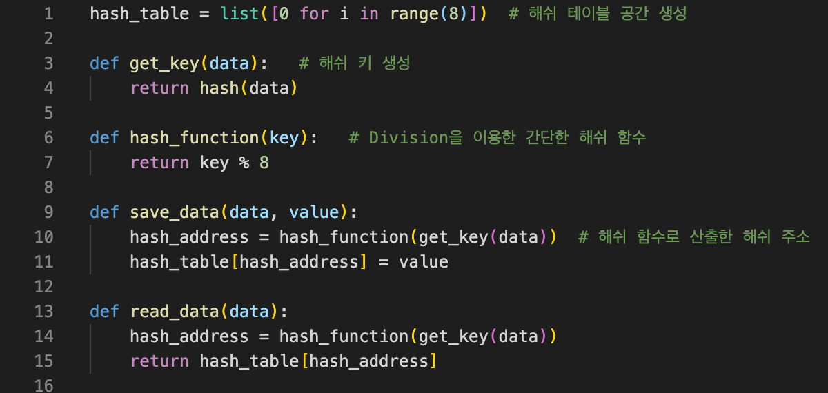 참고로 파이썬에서는 딕셔너리(Dictionary) 타입을 사용하면 해쉬 테이블을 별도로 구현하지 않아도 된다.