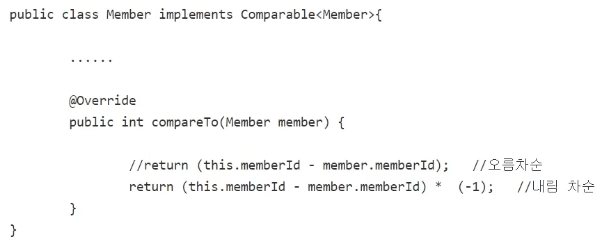 Comparable 인터페이스를 구현한 Member 를 해석해보면, 정렬 기준은 'memberId'가 되고, 정렬 방식은 '내림차순'이 됩니다. 여기서 만약 Member의 'name'을 기준으로 '오름차순' 정렬하고 싶다면, return this.name-member.name; 로 바꾸면 됩니다.